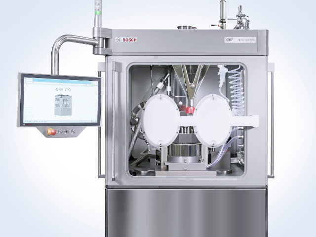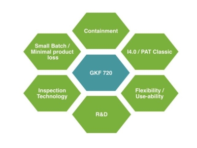Die GKF 720 – Modulare Kapselfüllmaschine HiProTect, auf Basis der GKF 720 Plattform, verarbeitet Pulver, Pellets und Tabletten und bietet ein waschbares Containment Konzept (WIP) für höchsten Bediener-, Maschinen- und Produktschutz bis zu OEB 5 Produktanforderungen. Sie produziert kleine Chargen für die Forschung und Entwicklung sowie für klinische Anforderungen unter Berücksichtigung realistischer Produktionsbedingungen.