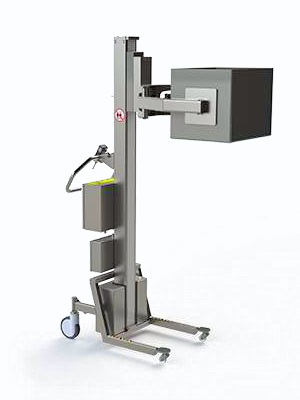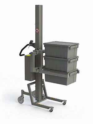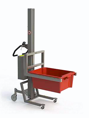 Ähnlich wie das Modell EC verfügt dieser Minilift über eine elektrische Scherenklemme mit Greifern, die mit weichem Gummi überzogen sind. Die zusätzliche Dreheinheit ermöglicht es darüberhinaus, die Kiste leicht zu drehen und zu entleeren. Der Minilift kann bis zu 120 kg heben.